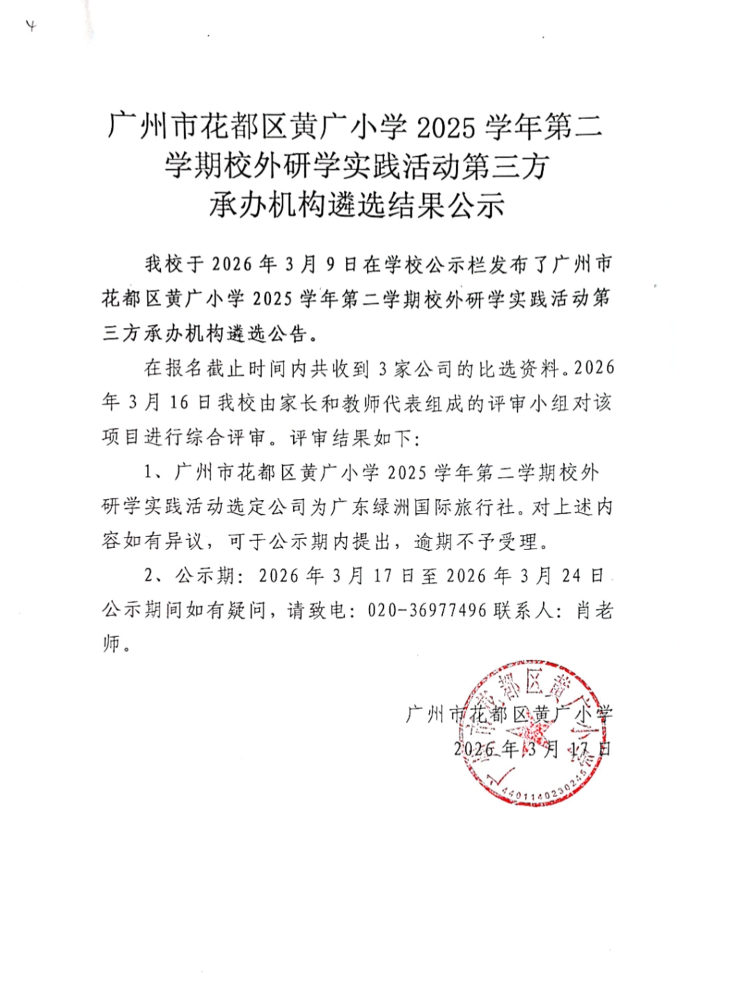 > 【公示】广州市花都区黄广凤凰北小学/黄广小学2026年春季研学公开询价项目评选结果公示